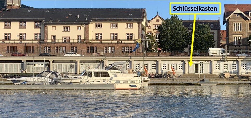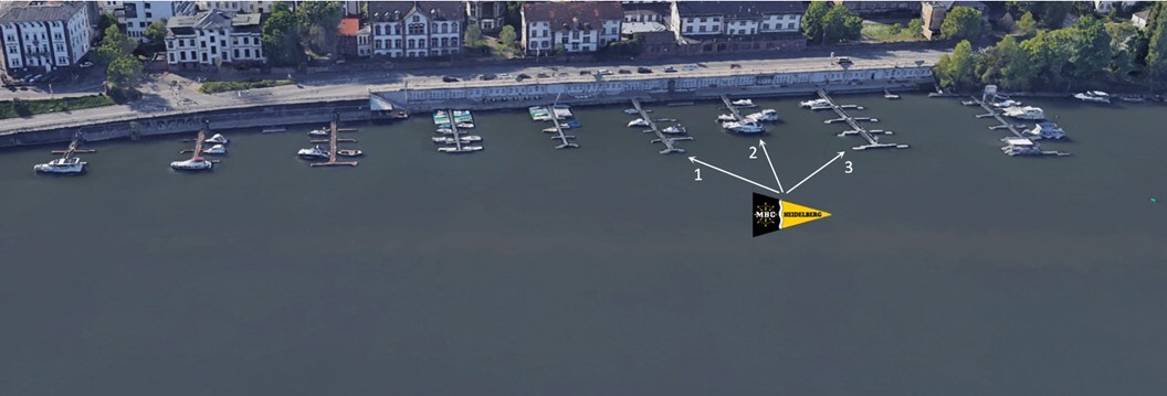 MBC Heidelbergs båtplatser finns vid brygga 1 till 3, markerade med vår föreningslogotyp samt skyltarna ”Steiger 1” till ”Steiger 3”.